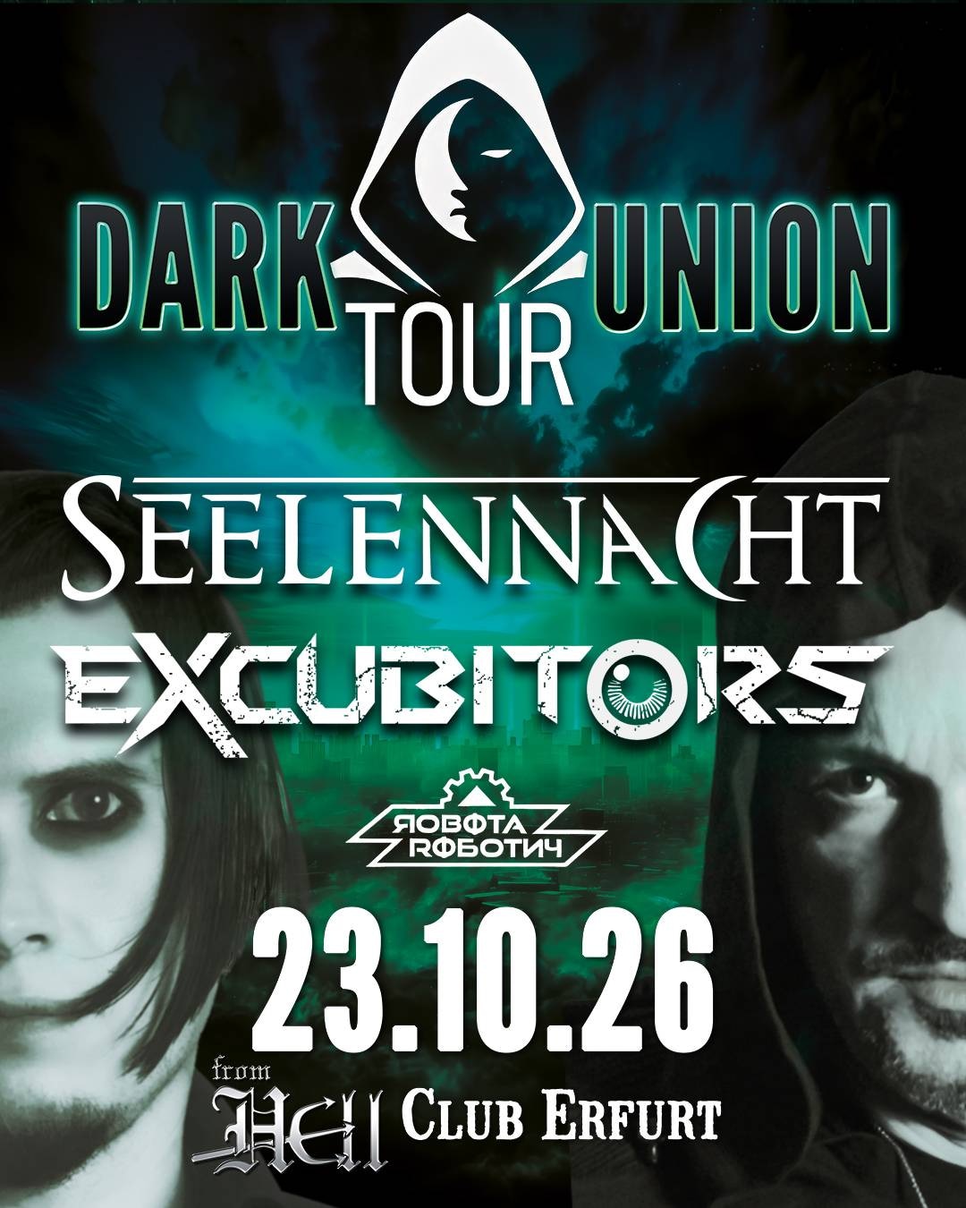 Seelennacht und Excubitors sind endlich und langersehnt zurück im renommierten Club From Hell in Erfurt! Es ist an der Zeit für die nächste Stufe des Dark Electropop und des Cinematic Synthpop! Am Freitag, den 23. Oktober 2026 wird es dort intensiv und vielversprechend dunkel-synthetisch! Es erwartet euch eine Full-Time Show mit brandneuen Songs und bewährten Klassikern in der Szene-bekannten Clubatmosphäre des Club From Hell. Beide Bands geben im Rahmen der DARK UNION TOUR eine Full-Time Show! Und als Clou wird das neue Seelennacht-Nebenprojekt „Robota Robotny“ den Abend mit einem 30-minütigen Auszug aus ihrem elektropunkigen Debütalbum eröffnen! Wir freuen uns auf einen vielversprechenden Konzertabend zusammen mit Euch!